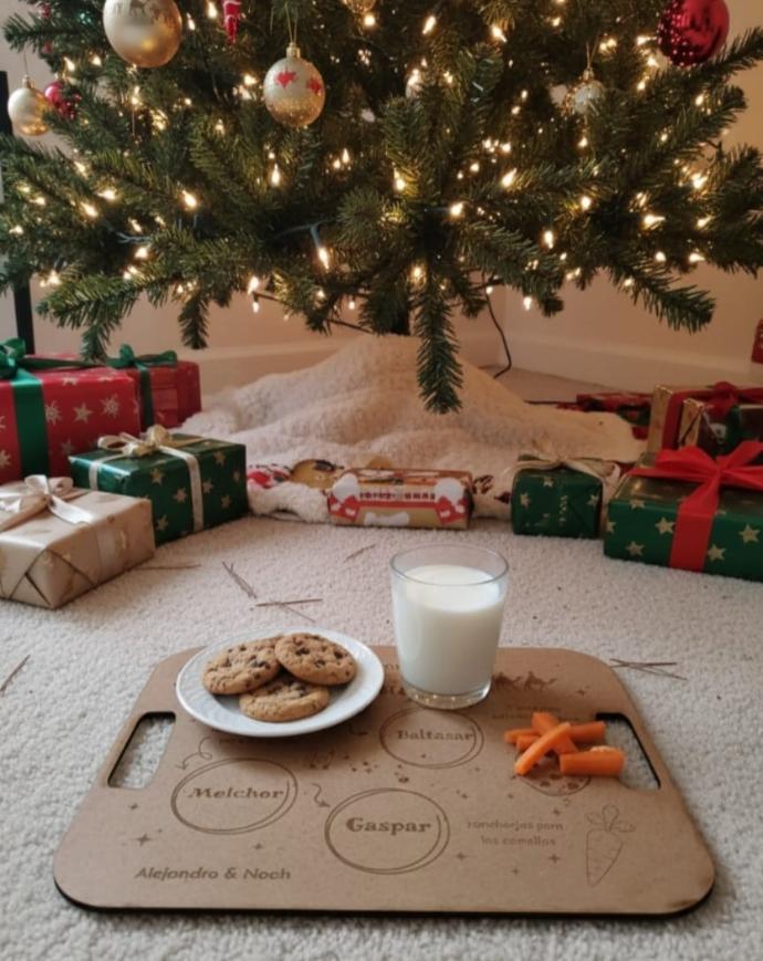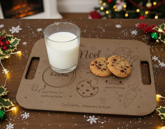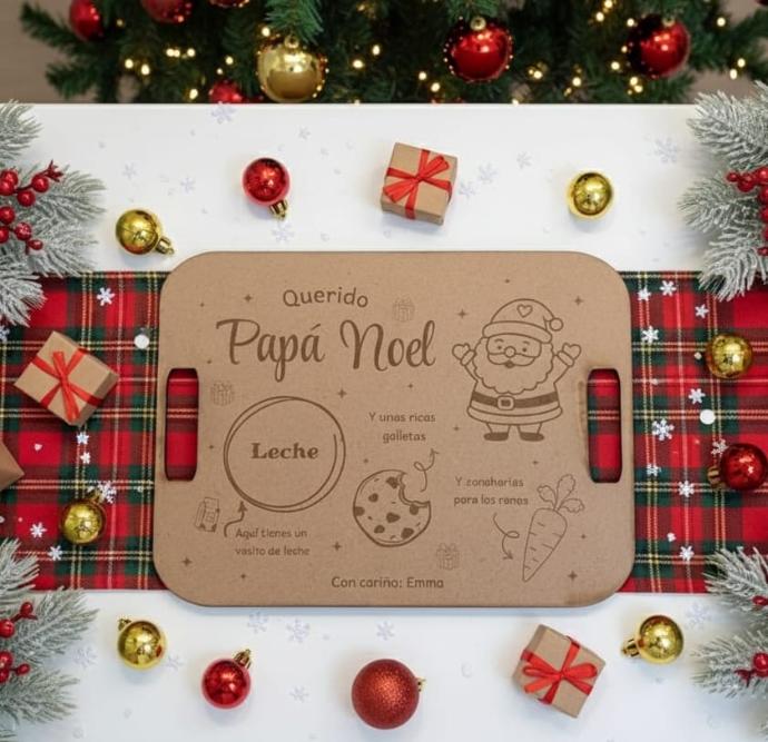 Esta bandeja fabricada en MDF con grabado láser no es solo un objeto decorativo, es el centro de una nueva tradición familiar. Imagina la emoción en los ojos de tus pequeños al preparar la leche y las galletas para Papá Noel y Reyes Magos justo antes de ir a dormir.