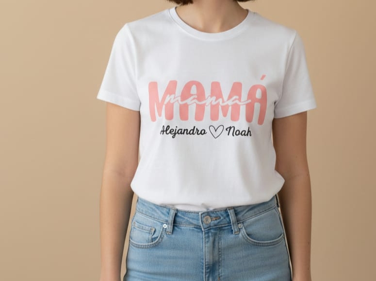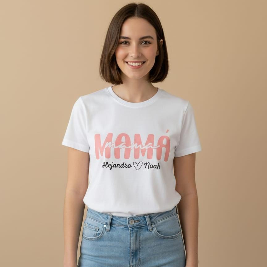 Camiseta personalizada de algodón e impresión con DTF o vinilo textil mamá más nombres.