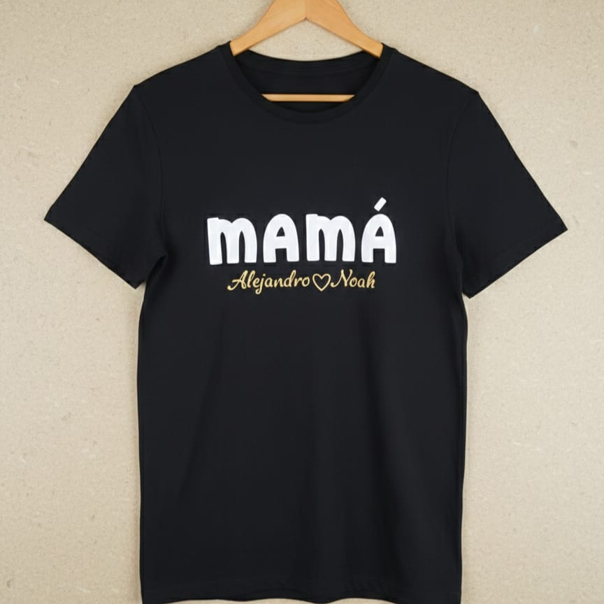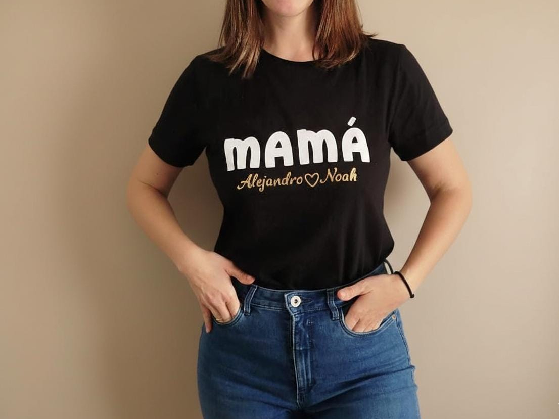 Camiseta personalizada de algodón e impresión con DTF o vinilo textil mamá más nombres.