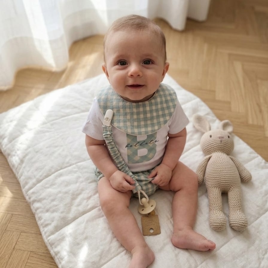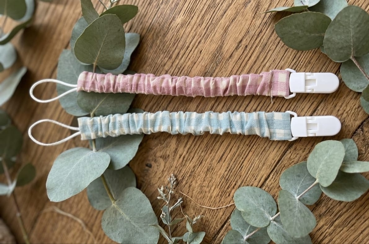 Chupetero de tela rizado con clip de plástico. Telas 100% algodón.