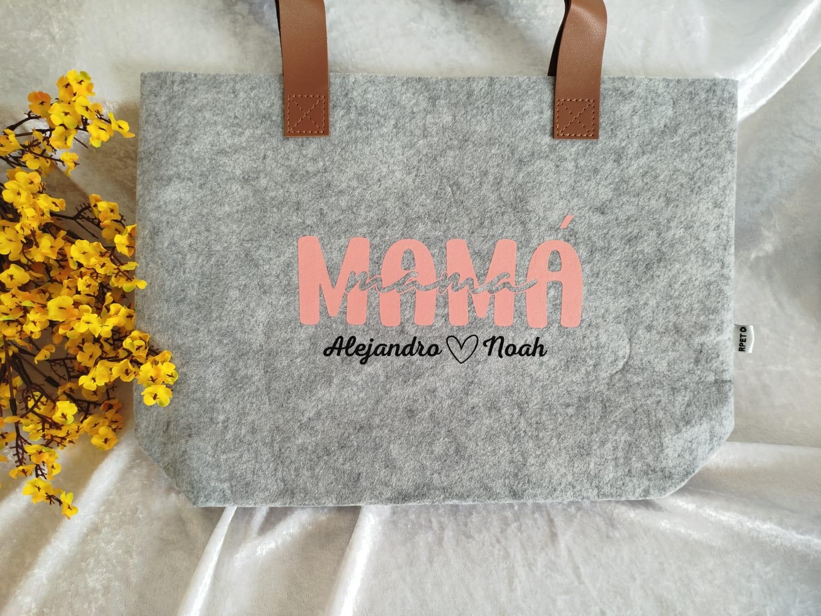 Bolso de fieltro personalizado "MAMÁ y nombres" en DTF o vinilo textil.