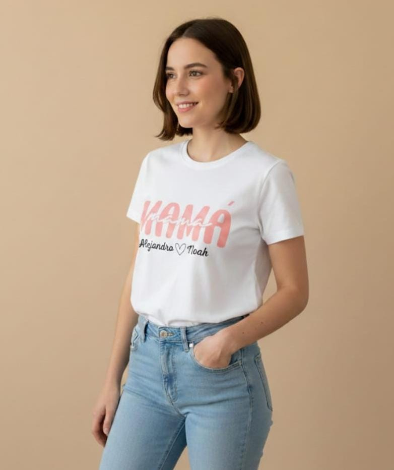 Camiseta personalizada de algodón e impresión con DTF o vinilo textil mamá más nombres.