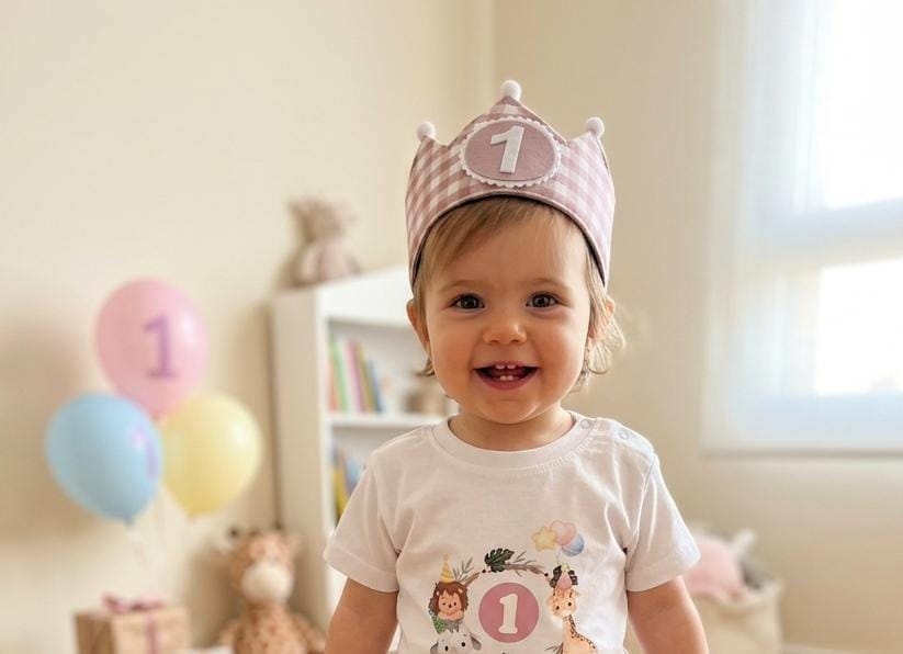 Corona de cumple picos y pompones. Confeccionada con telas 100% algodón y foam. Cierre ajustable con velcro. Incorpora 3 números a elegir. Los números se pueden quitar y colocar fácilmente gracias a su velcro. Material de los números: fieltro.