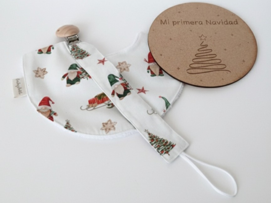 Seguro: Cintas de tela a juego con los baberos y un robusto clip de madera natural con orificio de ventilación, asegurando que el chupete esté siempre a mano y nunca en el suelo.